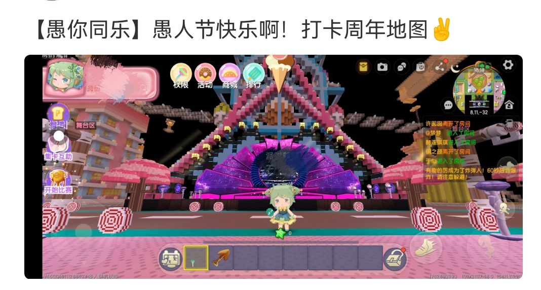 示例:打卡地点可以是棒棒糖乐园、蛋糕城、糖果工厂和舞台等,不限制但要在周年派对里!也可以跟好友一起合照哈哈,文案不用模仿我的哈,发挥你的聪明才智,提高中奖率!