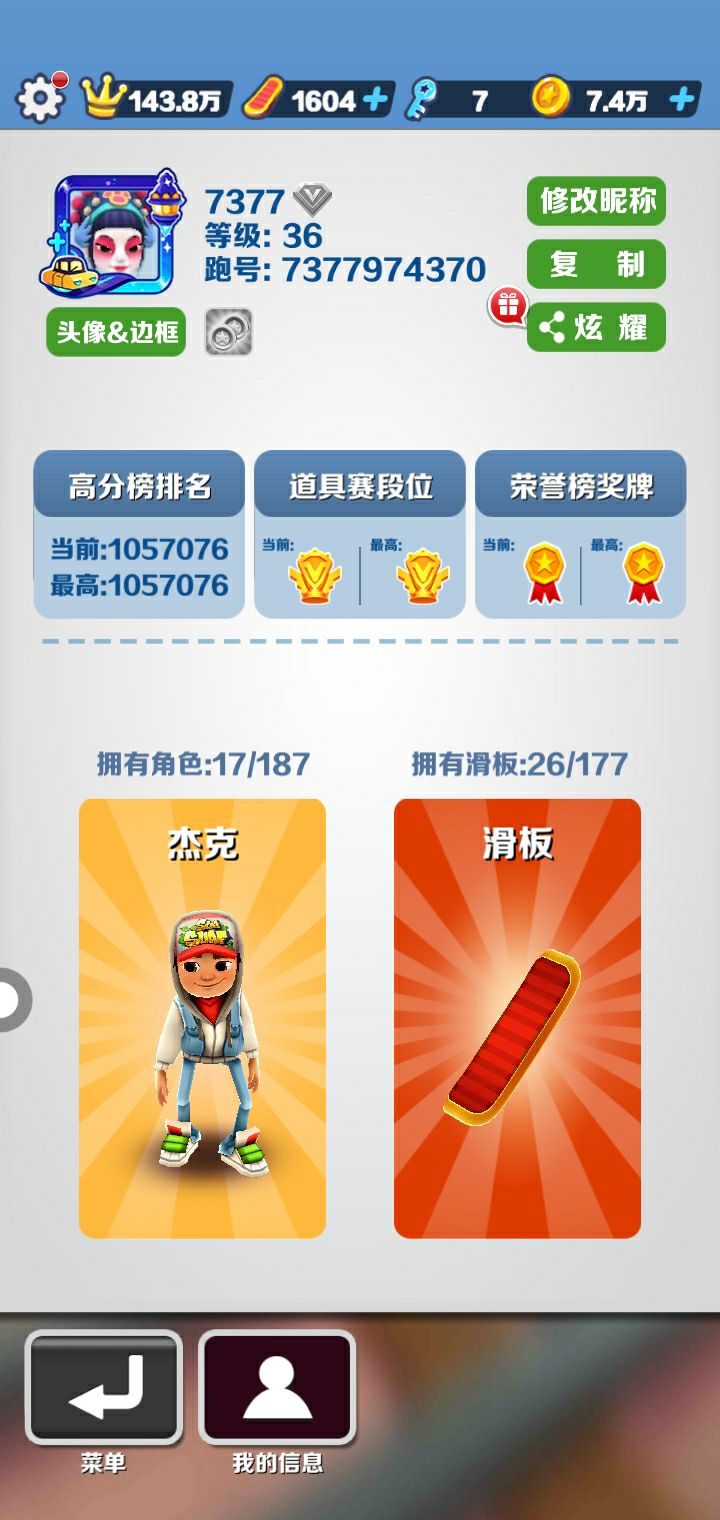 招徒弟,本人最高分143.8万,17个角色,22个滑板,4个背饰,跑号7377974370