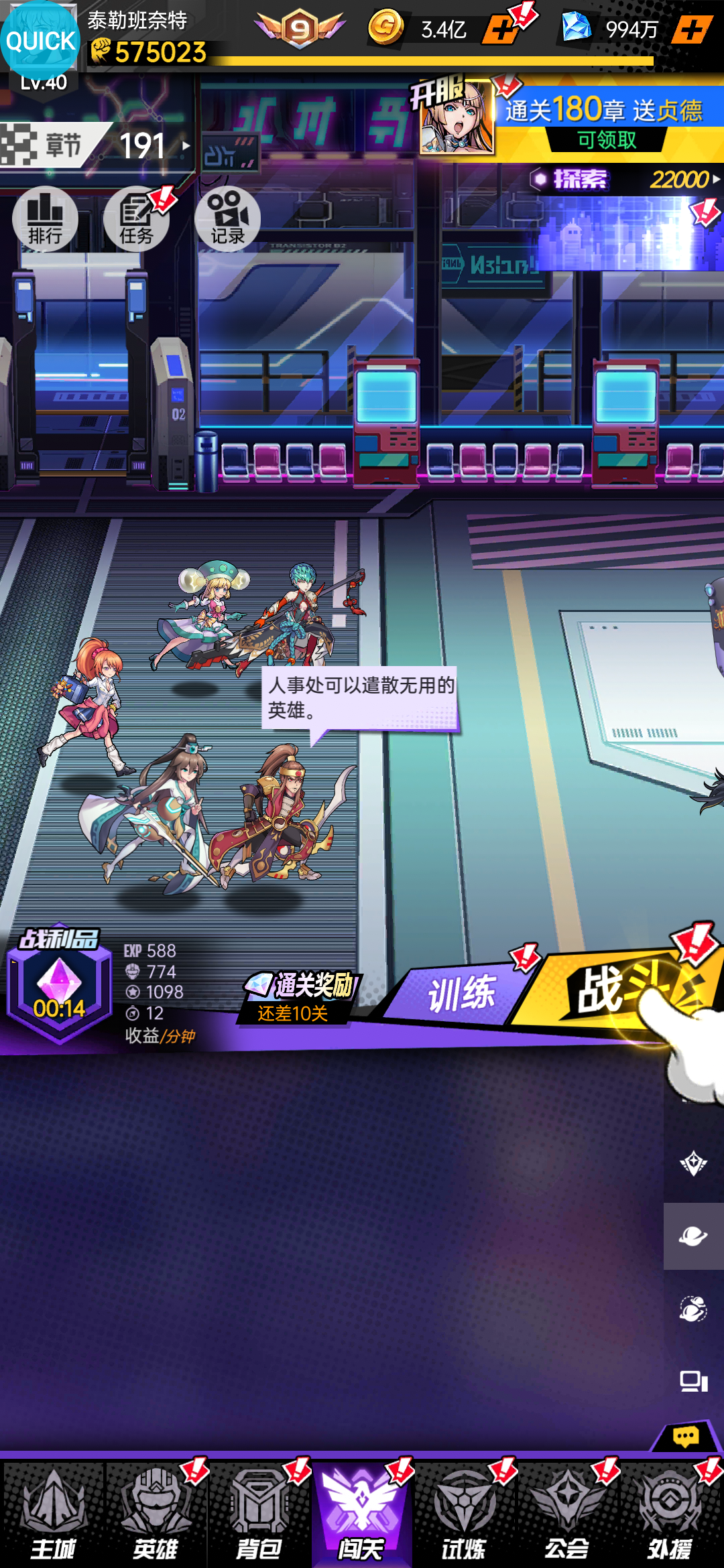 在这里可以进行基本战斗。通过闯关可以提升挂机收益,闯关越多,奖励越丰厚,这里也是提升玩家等级的最有效率的途径。