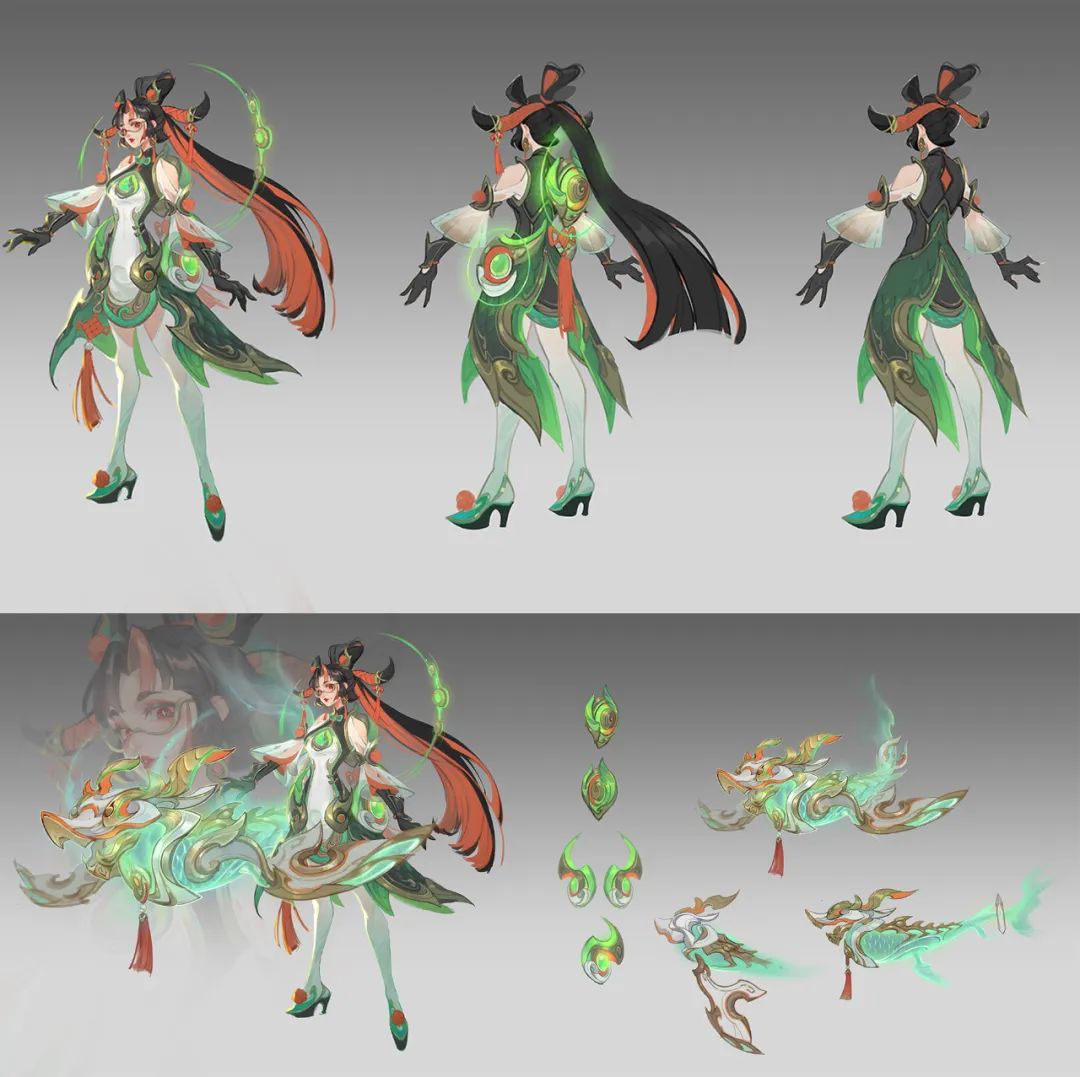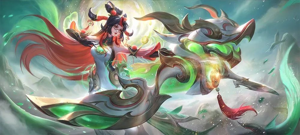 以“龙形的吞脊兽”和“殿脊两端的卷尾龙头”的形象,结合当代国潮元素,整体风格倾向于成熟酷炫,颜色倾向于绚丽(红、黄、绿),体验皮肤时仿佛游走在灯火通明、充满国潮味道的街道一般。