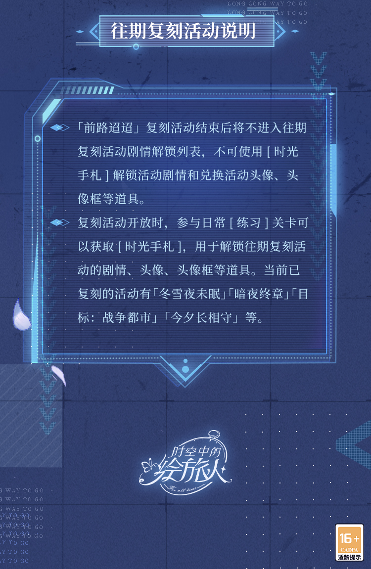 ※「前路迢迢」活动剧情不进入[时光手札]解锁列表。复刻活动期间掉落的[时光手札]可用于解锁往期活动剧情。