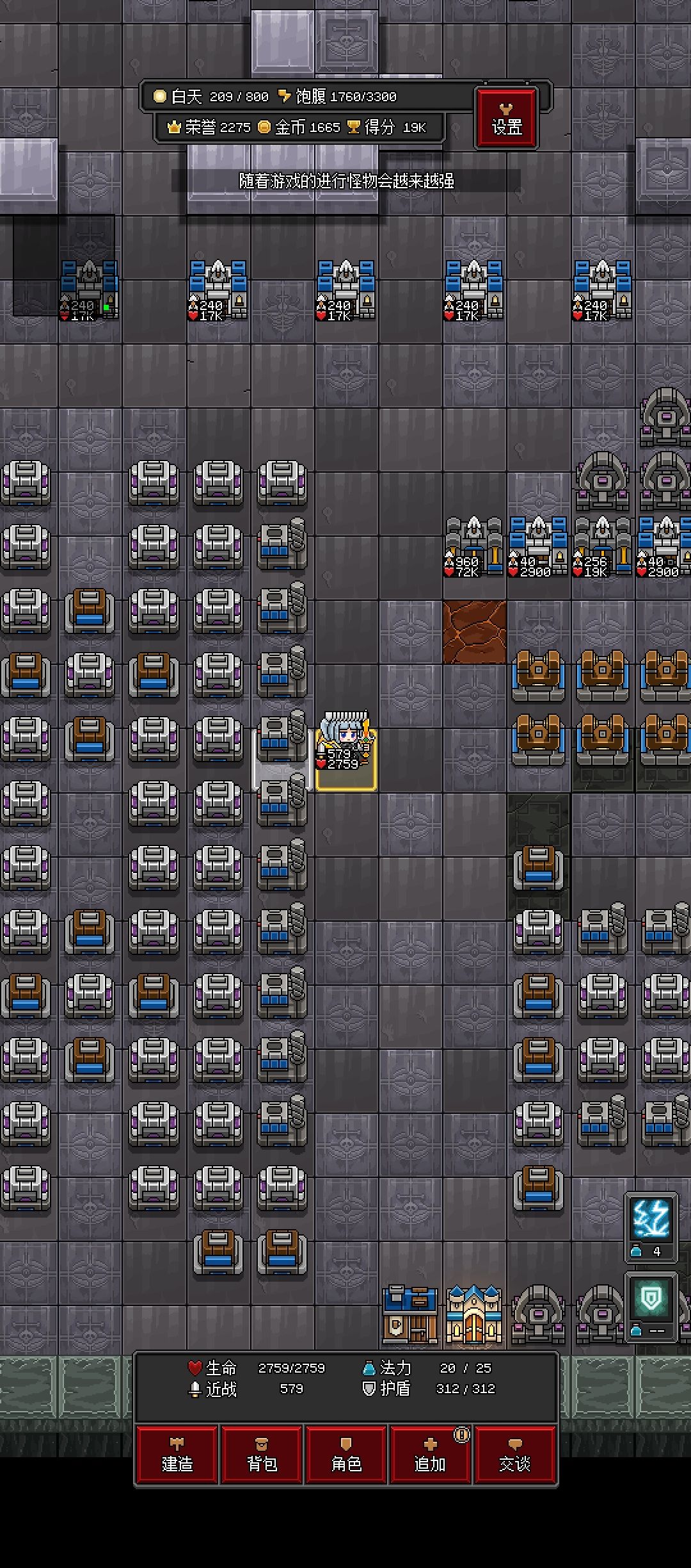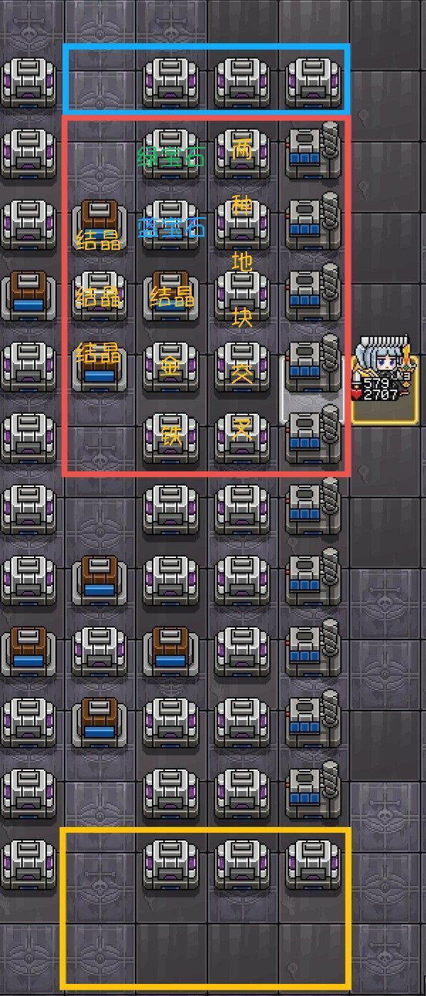 这个架构其实是通用的。 红框表示一个4*5小模块,可以左右两个模块共用中间的部分,大小是7*5;蓝框是上包边;黄框是下包边。 红线表示两种地块交互,按照线的顺序来。 黄线表示自选五种当前地形出现的材料,也是按照线的顺序重复。我这里特意将金和蓝宝石放在更靠近中间的位置,因为这两个位置可以给全部三个回收机功能。远一点则是更少价值的铁和绿宝石。 蓝线表示用于消耗魔能的某种材料,这里选择虚空结晶。 原理是这样的: 如果只有第一排的地块给矿机供能,矿机会略缺魔能(挖矿消耗360,回收地块获得300)。如果第一排再加上第二排的各种材料都只给矿机供能,魔能爆表,魔能消耗的速度不足。 显然要带上第二排,因为很多材料我们都不需要。这样就要考虑如何消耗掉第二排多余的魔能。 中转箱之间是可以互相传的,且耗能较快 ,所以构建两个中转或者三个中转,设置成同一产物即可耗能。三个中转耗能更快一点,除此之外与两个中转没什么区别。上图就是三中转结构。注意被中转的东西也应该被回收,所以再加一个回收机回收中转的东西。 这个时候肯定就有人问了,要是想要中转的物品直接被回收了咋整?这就涉及到游戏机制—— 中转优先级高于回收 ,这个特性太好用了。所以物品一定先进中转,然后消耗第二排多余的魔能;第二排魔能耗尽后,物品被回收机回收,又提供魔能用于中转,如果此时仍有物品则继续中转耗能;直至最后的物品被回收。这样就完美达到了溢流门的目的。 你可能还注意到,前两张图我在最下面又加了两个中转箱,它的目标与最下面回收地块的回收机相同。这是因为实际测试时发现最下面的一个矿机会囤货,检查发现最下面回收地块的回收机魔能一直是满的。所以就造了两个中转箱专门消耗掉这个魔能。至于为什么是满的,可能是矿机经常把自己的地块发给更靠下的回收机,或者取魔能时优先去更靠上的回收机,导致最下面魔能爆表,最上面没有魔能。 这个结构我个人认为是全图通用的,且不怕切换地图。比如在炼狱的话,最后矿机里面就是虚空石和紫宝石黄宝石。留这些在矿机里面是因为他们价值高,出现的可能性小,就能等待更多回合再去收矿了。如果缺金或者缺铁,那就直接卖掉黄紫宝石,再去买就好了,没必要矿机去收。 感谢看到这里,如果有什么建议欢迎提出。