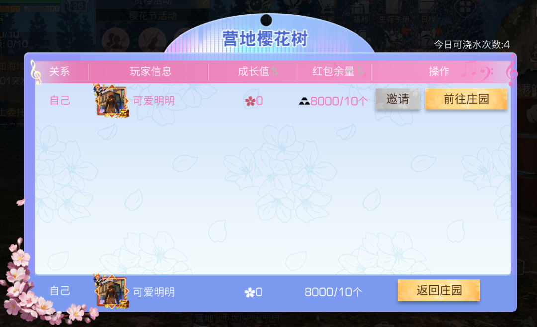 幸存者每天可获得4次浇灌樱花树的机会