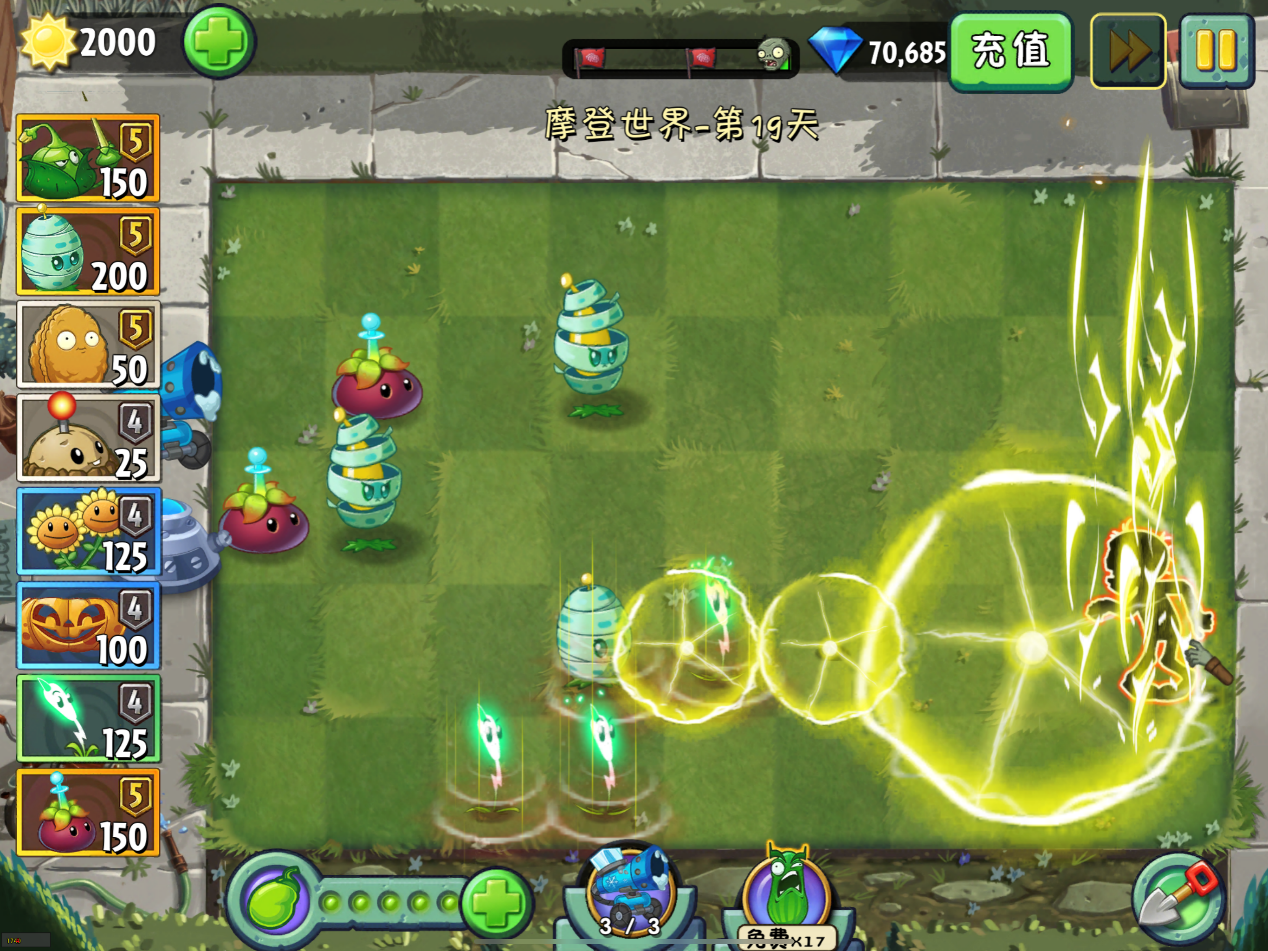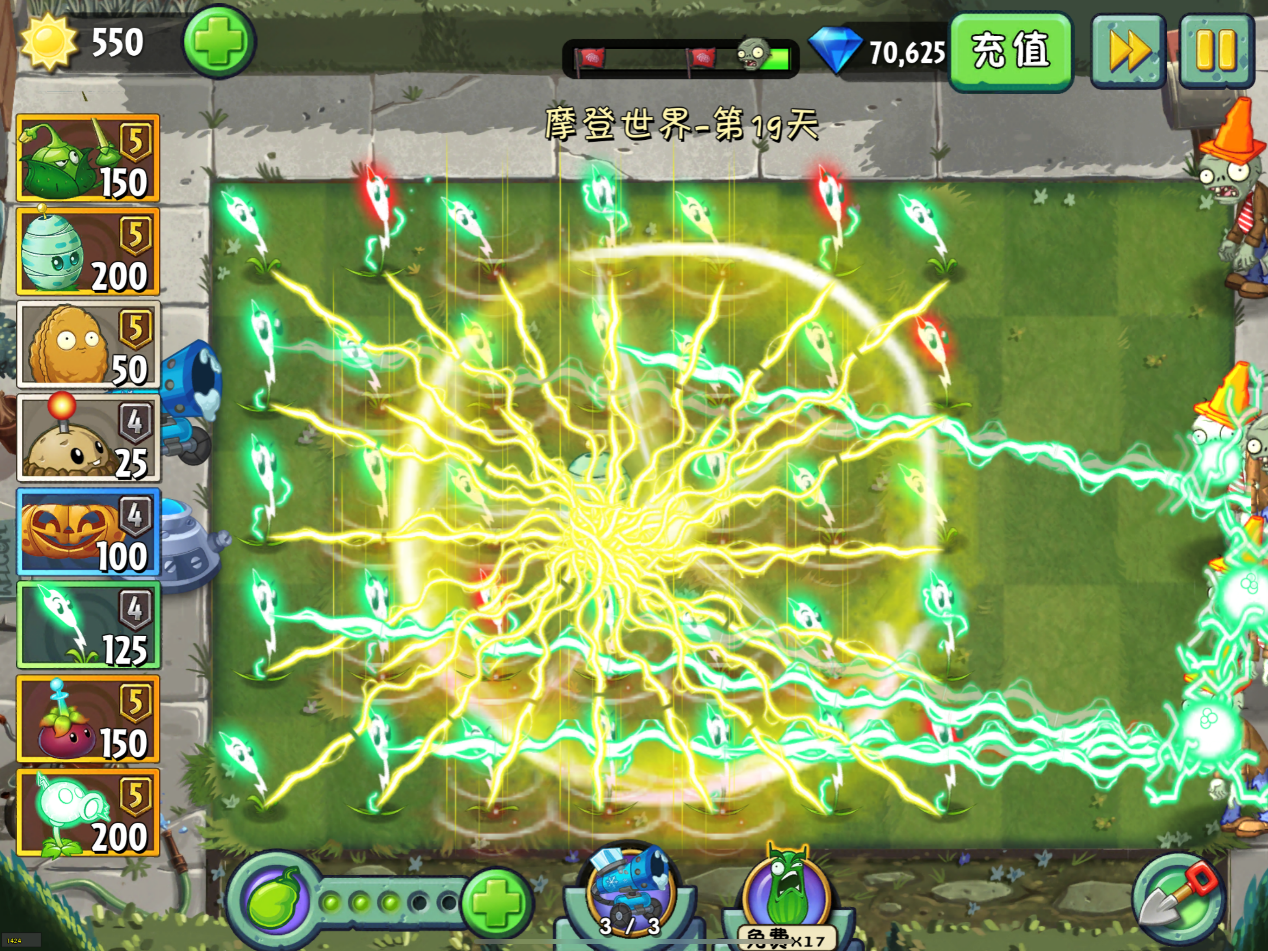 为蓄电雪松果释放大招,瞬间将全屏范围内电系植物的能量传送至植物上。