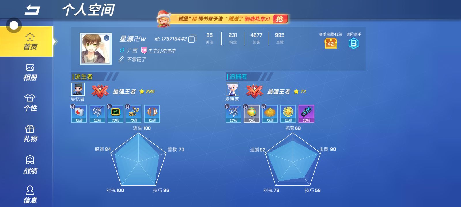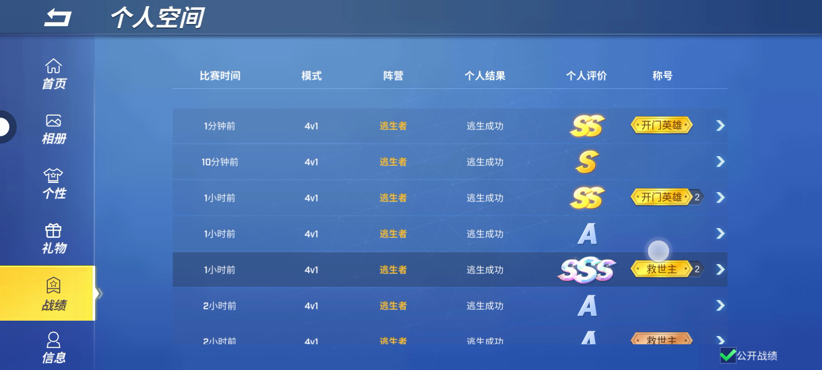 姓官*****,打了八局一直卡在94逃生率,非要让我打到十局,也是第12次刷新100逃生记录