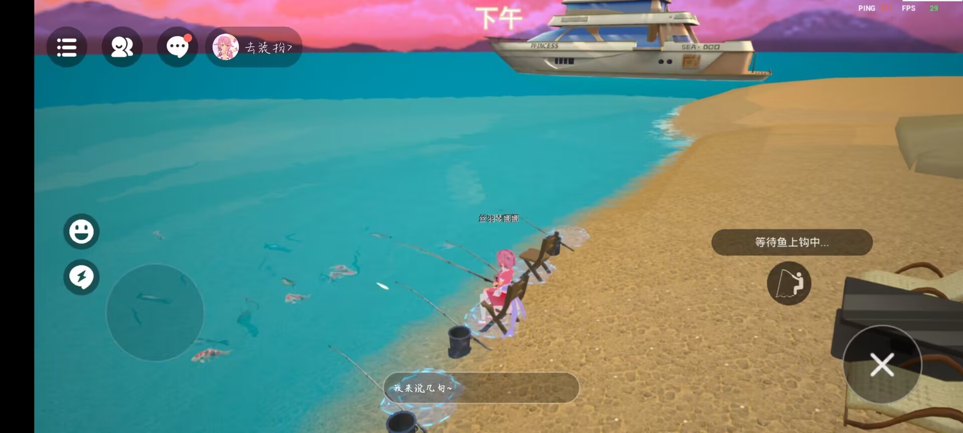 下午呢,可以一起钓鱼🐟🐟,需要等待一会鱼才会上来噢,还会钓到神奇小道具,比如魔法棒什么的。