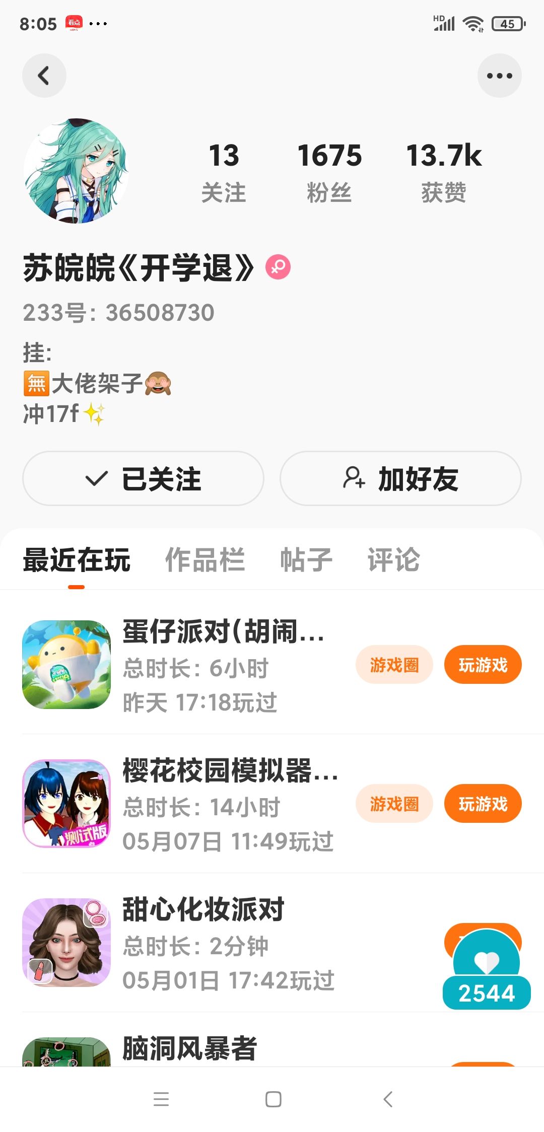 处Cp,男,13岁,初一,不长玩游戏