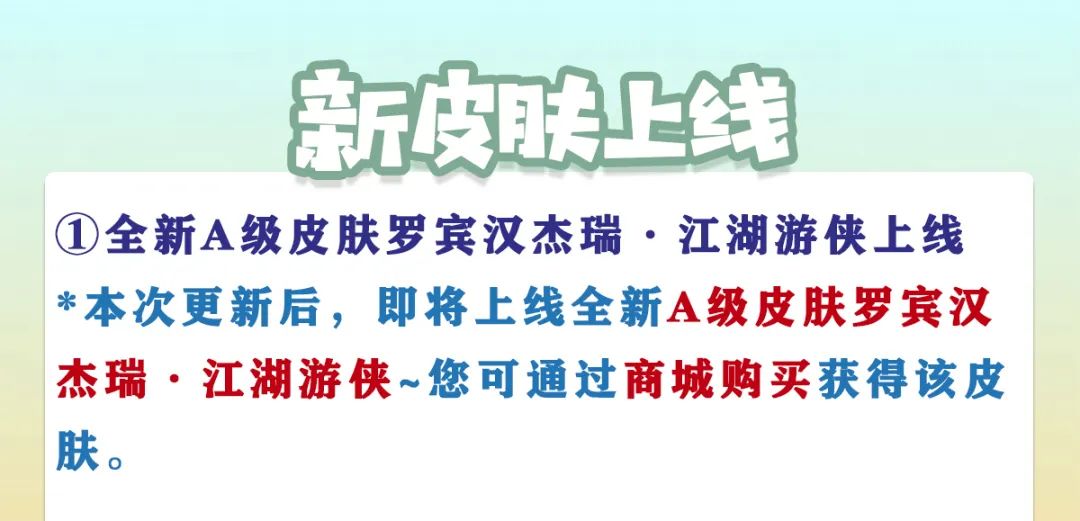 本次更新后,即将上线全新A级皮肤罗宾汉杰瑞·江湖游侠 ~