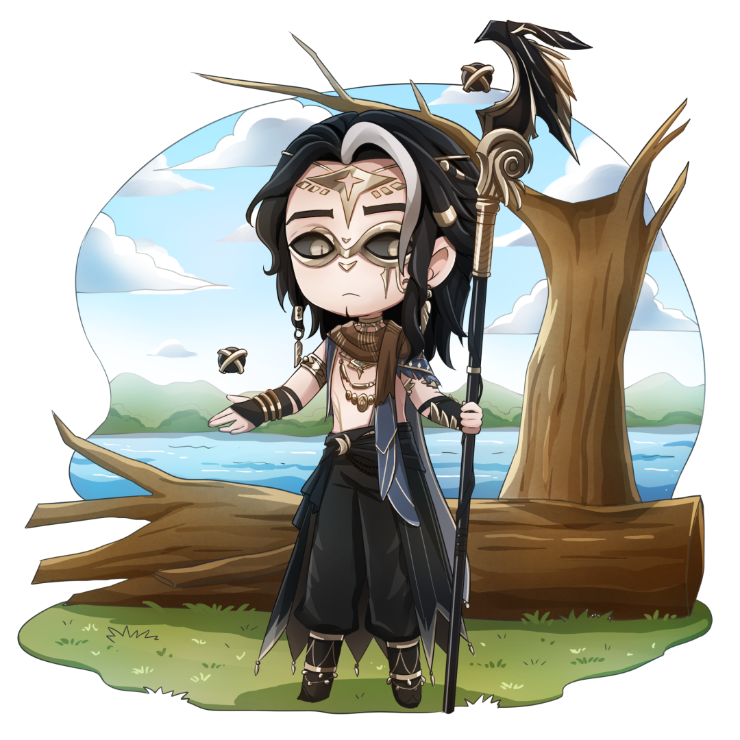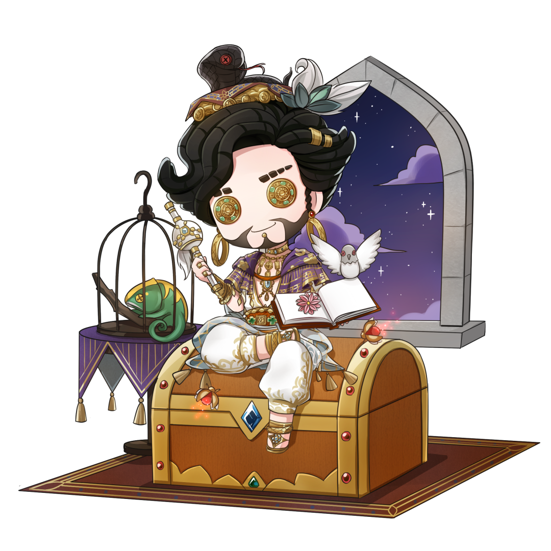 岩鸽帽子上的黑色毒蛇正吐着信子,衣领周围熠动着星河般的淡紫色流光。手中的魔棒蕴藏着神奇的魔法。