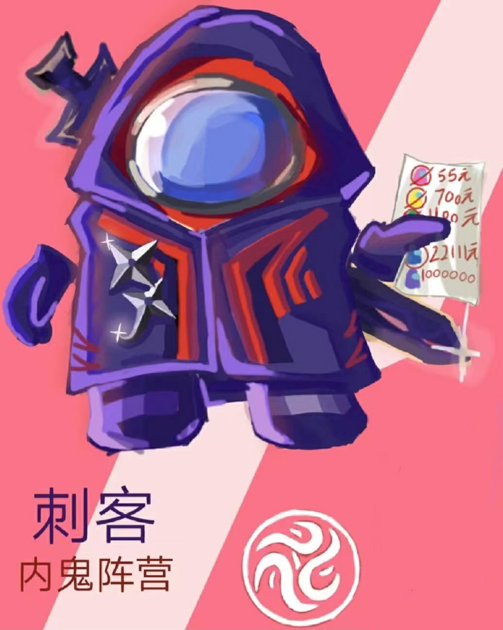 语音:船员们,在我的杀戮下挣扎吧。不过挣扎也没有用。你们还是会给我刺穿心脏。 技能一:速度加快50%并且开启关灯状态。开局CD 15秒。会议后CD 25秒。只能使用四次。(主动) 技能二:每回合刀人CD减五秒。(被动) 彩蛋语音:刀了五个人且获得了MVP:“你们在我死亡的威胁下怎么样啊?″
