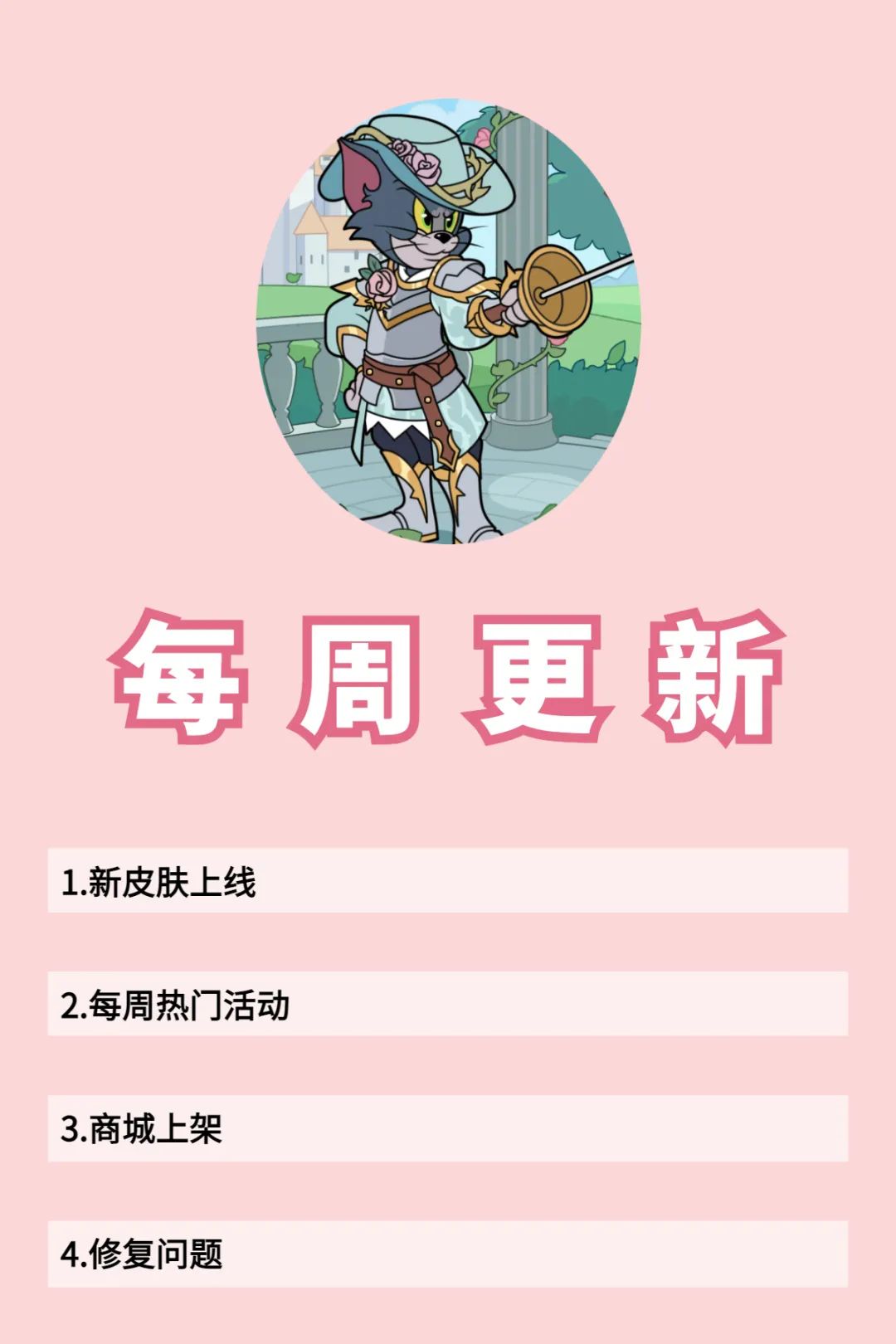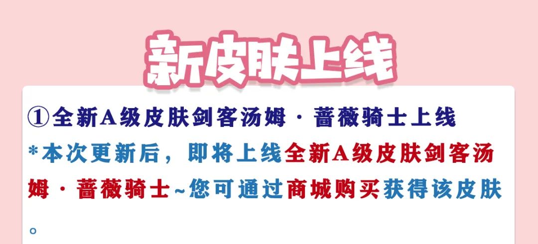 1. 全新 A级皮肤剑客汤姆·蔷薇骑士上线 *本次更新后,即将上线全新 A级皮肤剑客汤姆·蔷薇骑士 ~