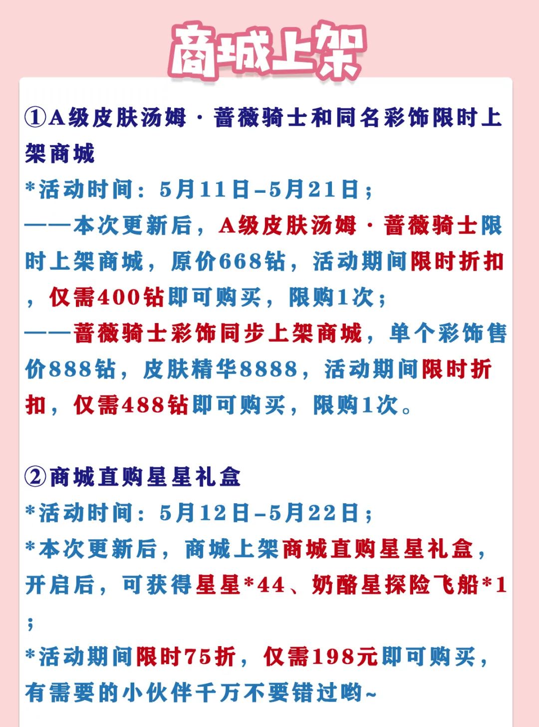 ——本次更新后, A级皮肤汤姆·蔷薇骑士限时上架商城,原价668钻,活动期间 限时折扣 , 仅需400钻 即可购买,限购1次;