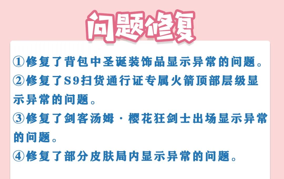 修复问题 1. 修复了背包中圣诞装饰品显示异常的问题。 2. 修复了S9扫货通行证专属火箭顶部层级显示异常的问题。 3. 修复了剑客汤姆·樱花狂剑士出场显示异常的问题。 4. 修复了部分皮肤局内显示异常的问题。