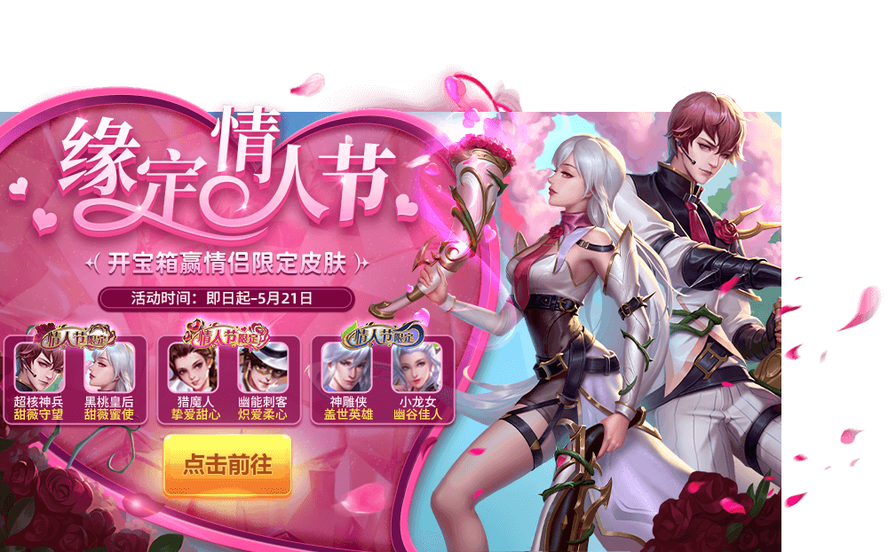 开宝箱累计玫瑰花就有机会赢取以下皮肤: 魅魔公主-梦有灵犀 铁扇公主-带绾同心 牛头人酋长-白首不离 冥王哈迪斯-心主千秋 吕布-铮血柔情、貂蝉-花月佳人 周瑜-长安曲雁、小乔-金陵含黛 神雕侠-琥珀境灵、小龙女-翡翠境灵 神雕侠-盖世英雄、小龙女-幽谷佳人 猎魔人-挚爱甜心、幽能刺客-炽爱柔心 凯撒大帝-青暝缱绻、埃及艳后-琼芳不渝 超核神兵-甜薇守望、黑桃皇后-甜薇蜜使 还有情人节专属-铭牌、密恋520铭牌-铭牌、爱神丘比特-守卫皮肤、鹊舞花飞传送特效、鹊桥相会传送特效等情人节专属好礼等着大家呀!一起来英魂过个甜甜的情人节叭~