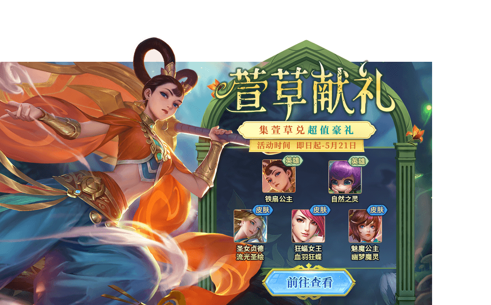 打开换萱草皮肤礼包有机会获得铁扇公主、自然之灵、圣女贞德-流光圣绘、狂蝠女王-血羽狂蝶、魅魔公主-幽梦魔灵!