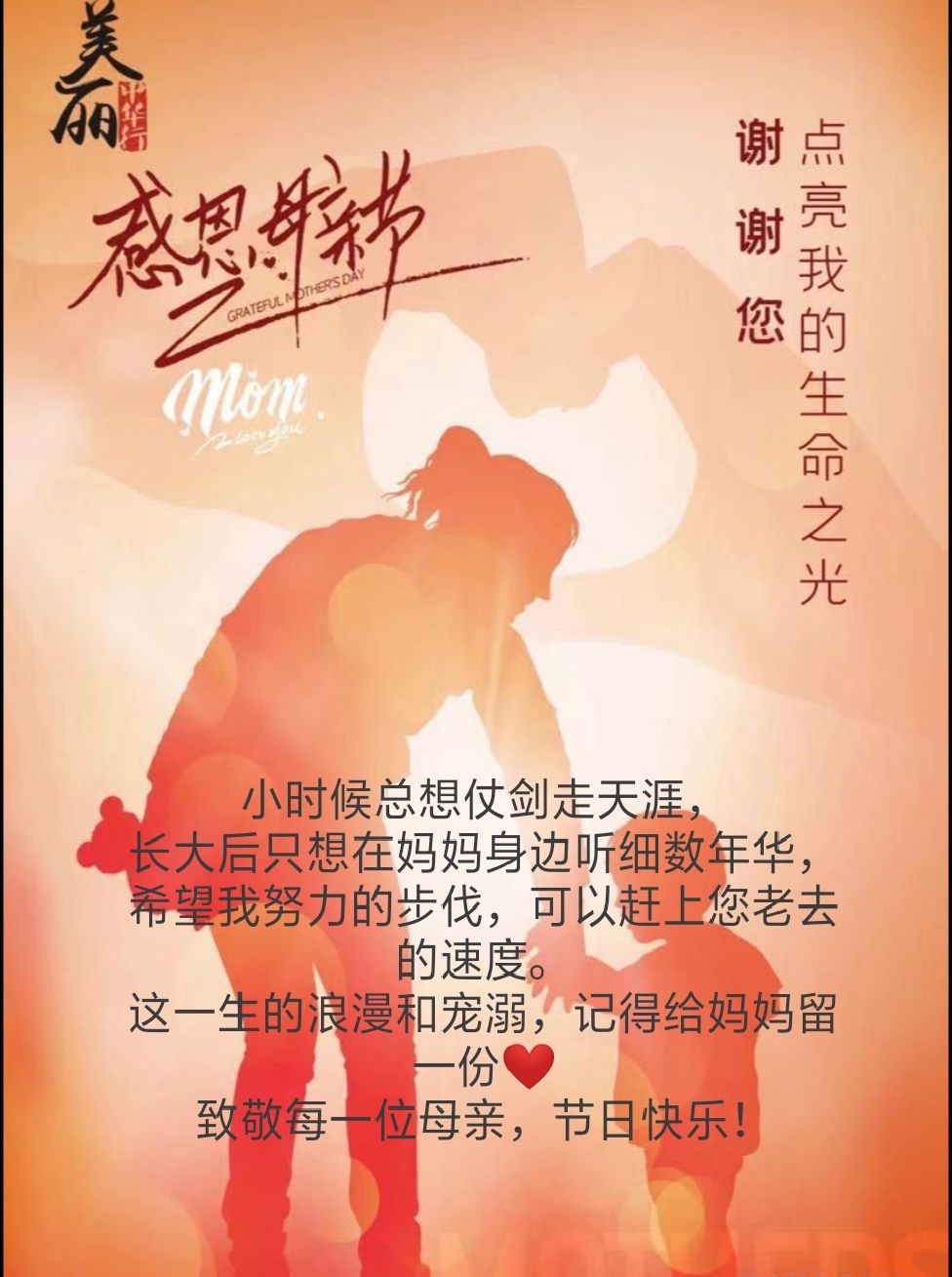 妈妈,今天是5月14日母亲节,我愿您快乐多一点,烦恼少一点;健康多一点,伤病不再有;幸福多一点,我不再让你担心。母亲节来到,我只想和您说声:妈,辛苦了!愿您永远健康,永远快乐,永远美丽,永远幸福!