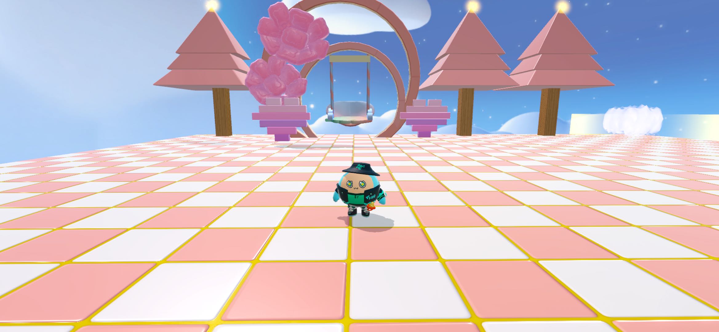挑战成功的小蛋仔可以坐上秋千拍照打个卡哦~终点线在右边别走错啦