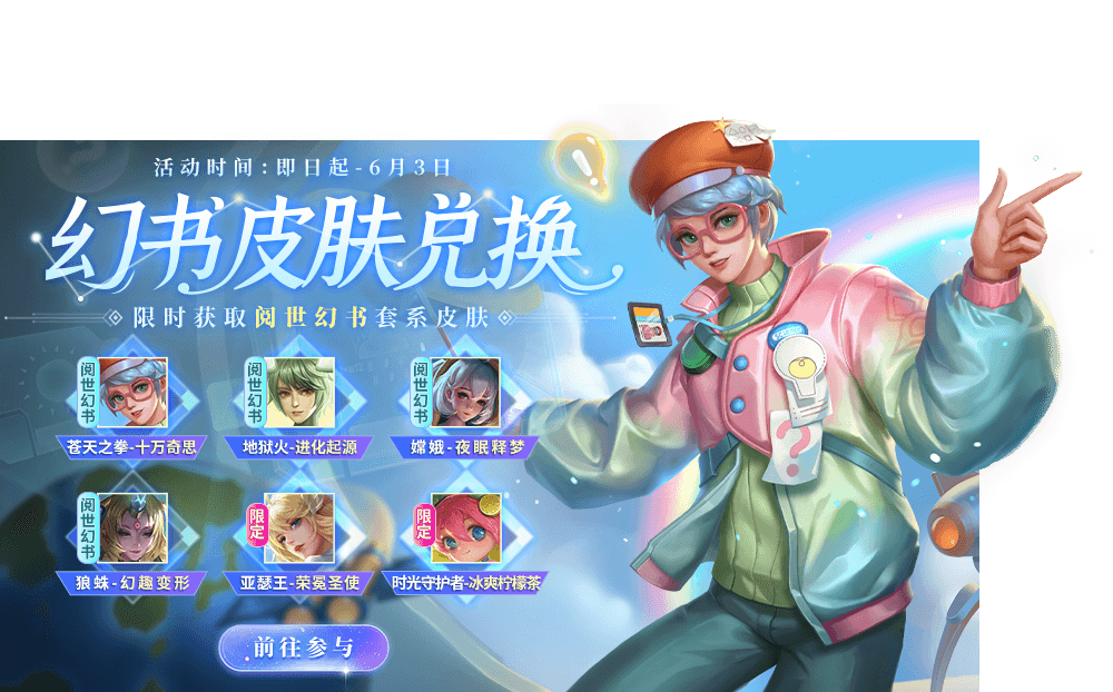 活动时间 5月27日-6月3日 活动内容 幻书皮肤兑换开启!限时获取苍天之拳-十万奇思、地狱火-进化起源、嫦娥-夜眠释梦、狼蛛-幻趣变形、曹操-致胜挥击等好礼!