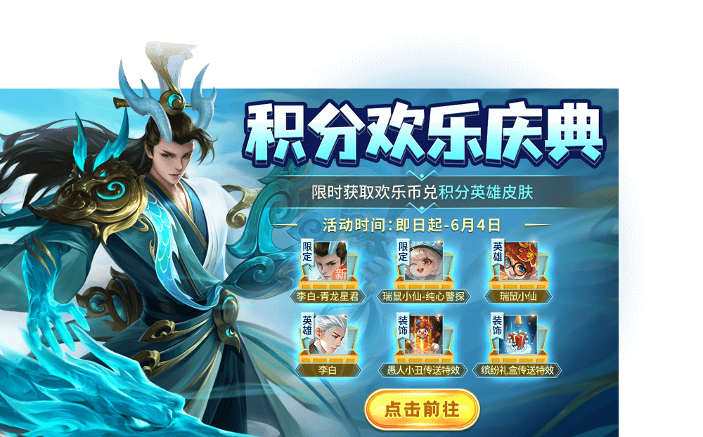 活动时间 5月26日-6月4日 活动内容 活动期间参与积分欢乐庆典,限时获取欢乐币即可兑换全新皮肤李白-青龙星君、瑞鼠小仙-纯心警探、瑞鼠小仙、李白、愚人小丑传送特效等奖励。 李白-青龙星君、瑞鼠小仙-纯心警探于5月26日-6月1日享九折兑换。