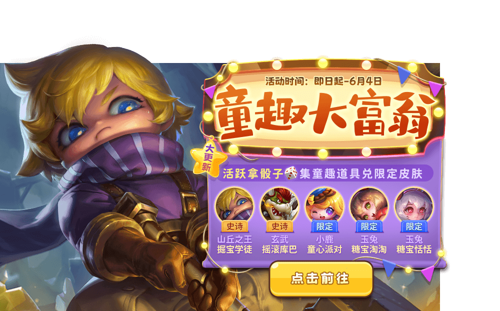 活动时间 5月26日-6月4日 活动内容 童趣大富翁活动开启,活动期间完成登录、参与排位、纷争圣坛等任务可获得骰子,累计使用骰子还有儿童节铭牌、童子福袋奖励。 通过投掷骰子得到一定点数并走出相应的步数,根据走到格子将触发相应事件获得奖励,收集到童趣道具还可额外兑换山丘之王-掘宝学徒、玄武-摇滚库巴、小鹿-童心派对等奖励!