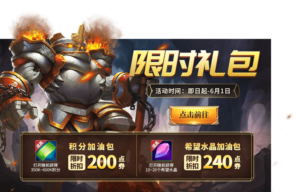 活动时间 5月26日-6月1日 活动内容 商城上架“希望水晶加油包”、“积分加油包”。 活动奖励 “希望水晶加油包”限时六折,打开随机获得10-20个希望水晶; “积分加油包”限时五折,打开必得350k-600k积分。
