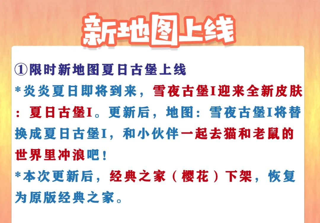*炎炎夏日即将到来,雪夜古堡I迎来全新皮肤:夏日古堡I。更新后,地图:雪夜古堡I将替换成夏日古堡I,和小伙伴一起去猫和老鼠的世界里冲浪吧!