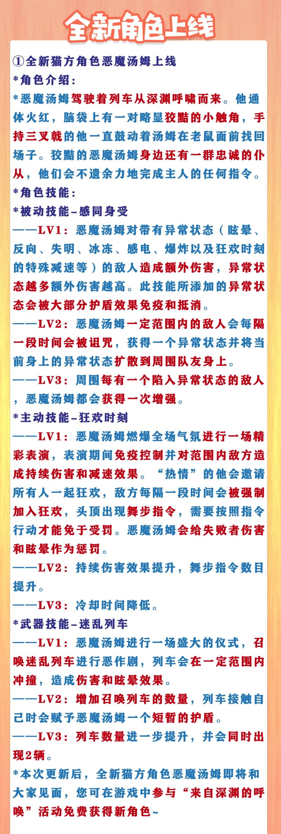 *本次更新后,全新猫方角色恶魔汤姆即将和大家见面,您可在游戏中参与“来自深渊的呼唤”活动免费获得新角色~