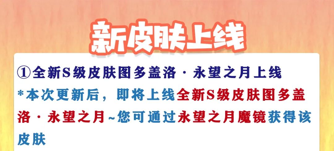 *本次更新后,即将上线全新S级皮肤图多盖洛·永望之月~您可通过永望之月魔镜获得该皮肤。
