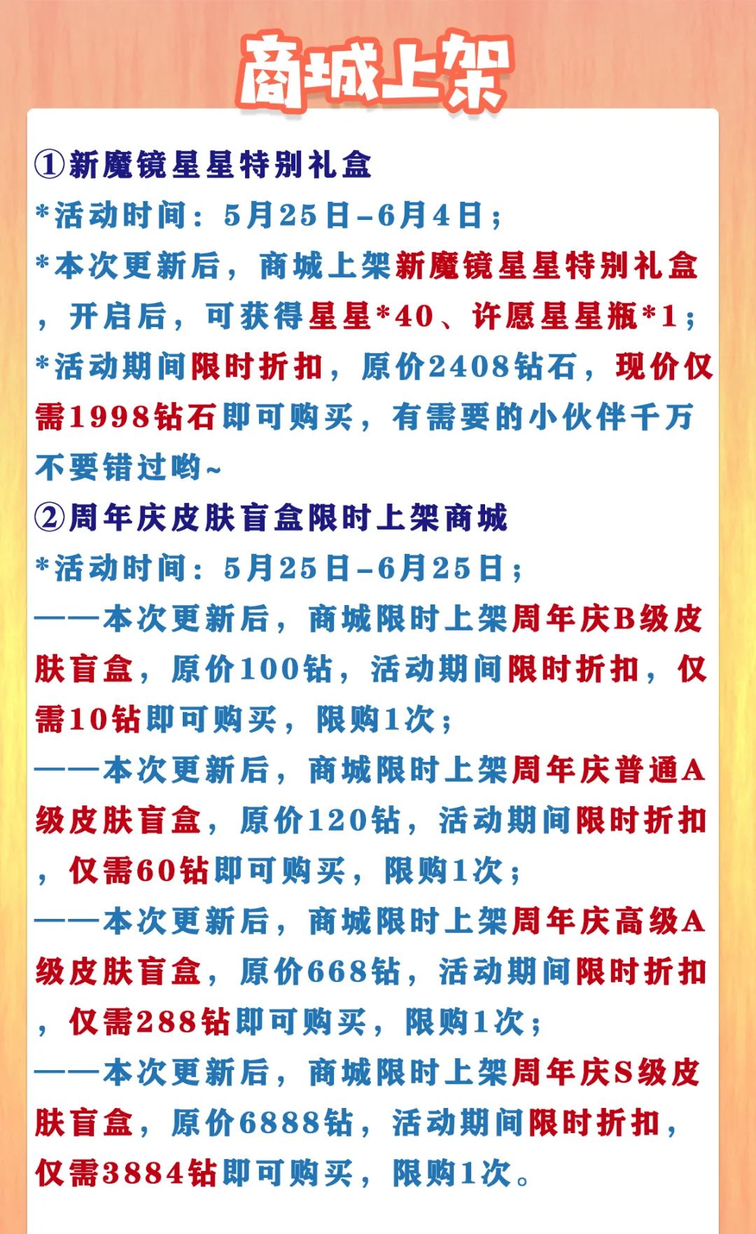 ——本次更新后,商城限时上架周年庆高级A级皮肤盲盒,原价668钻,活动期间限时折扣,仅需288钻即可购买,限购1次;