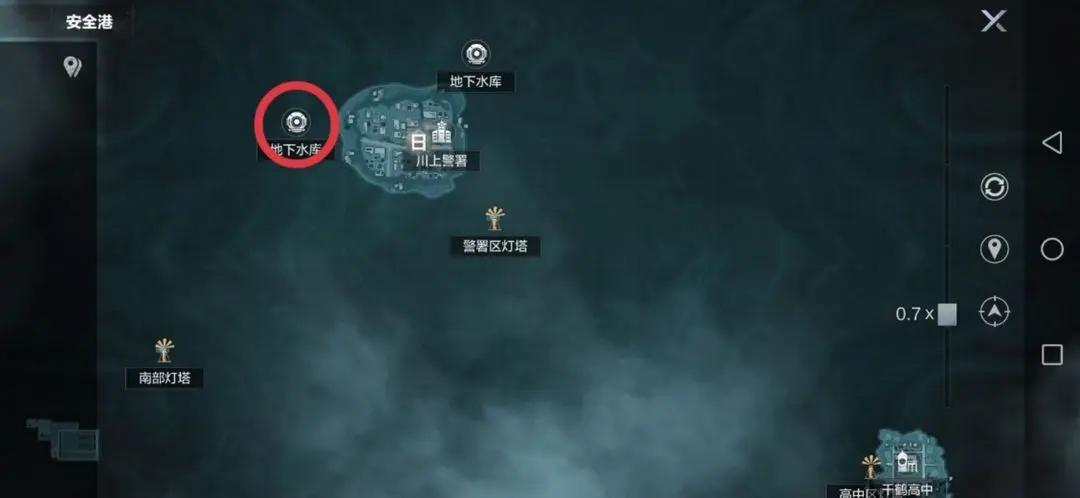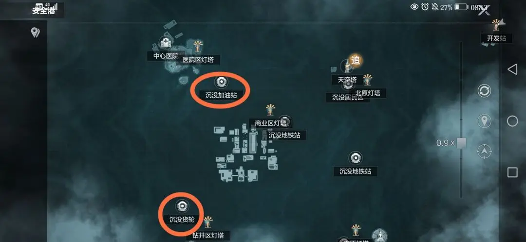 但是作为挖矿小能手的我,当然要掏出家底秘籍,给大家推荐一个最好的挖矿地点,那就是位于浮草川风雷寺灯塔旁边的“沉没商业街”!(就是下面画圈圈这个神奇的小地方)