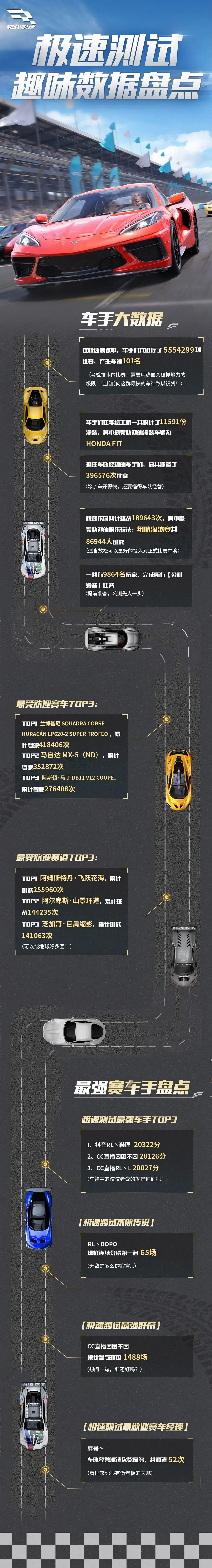 有的车手拼的就是技术,以20322分加冕称王有的车手独孤求败,以65场连胜笑傲赛道!而有的车手则另辟蹊径,以“肝”取胜......“极速测试”趣味数据新鲜出炉!想知道车手们在本次测试中一起打出了哪些有趣的数据吗?那就快下拉长图一起看看吧!