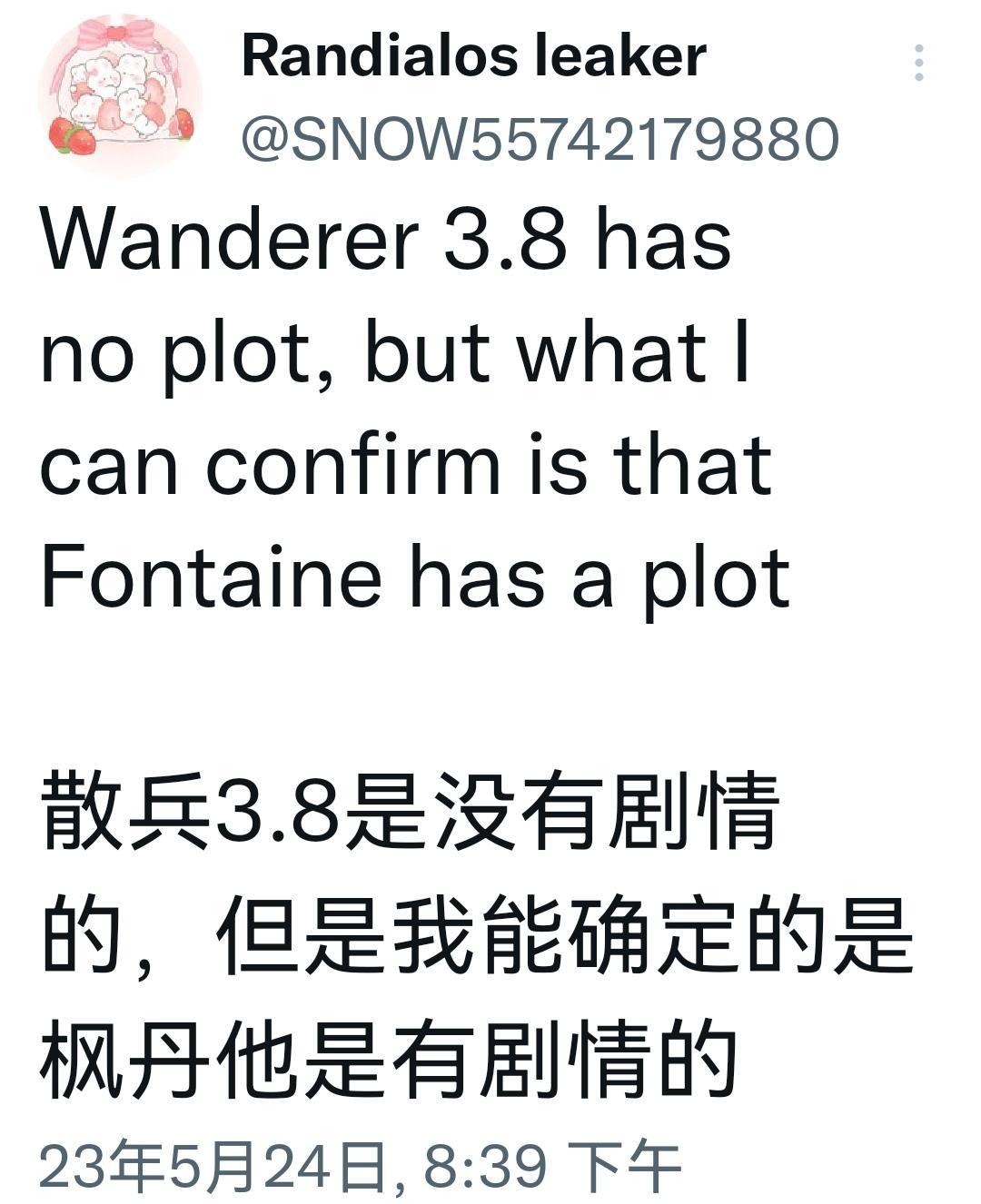 值得一提的是,这位准确度极高的《原神》爆料者Vississ在其分享的帖子中揭示了流浪者将前往枫丹的消息,并否定了他在3.8版本中出现的谣言。尽管流浪者不会在3.8版本的剧情中登场,但他将在枫丹地区的故事中发挥重要作用。据报道,流浪者很可能会从须弥3.6版本的新地图前往枫丹,这将成为他在游戏中访问的第三个主要地区。