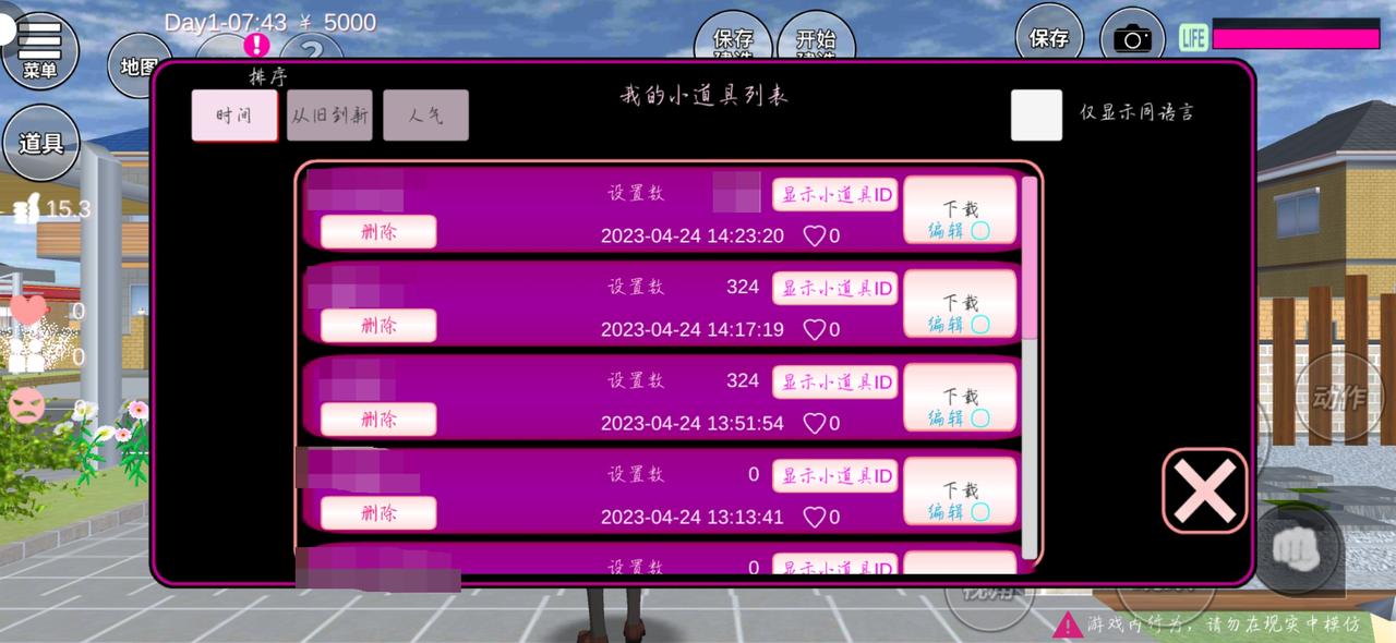 只要有【分享-下载】状态栏,都可以从【我的小道具列表】查询到自己的建筑存档哦!