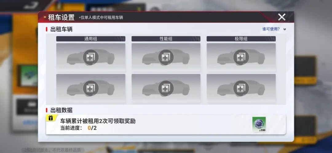 俱乐部耐力赛的规则其实并不复杂,在熟悉规则后,上手跑几圈就能完全掌握。这里还有一些小细节需要注意,首先是「租车」功能,车手们每天可以选择驾驶1辆其他成员设置出租的车辆参加比赛,这对于车辆不多的萌新车手是个好消息。