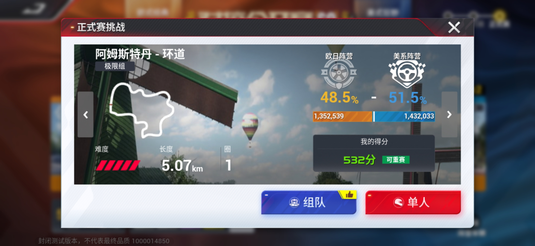 而细化到每一场具体的比赛,玩家可以选择「组队」与「单人」两种模式,组队模式更具趣味性的同时,也更考验团队策略。即使个人实力较强,但如果队友排名不佳,也可能会遗憾落败。这里比较推荐大神车手跑单人模式,一马当先甩开对手;萌新车手可以选择组队模式,被队友带飞也是不错的体验~