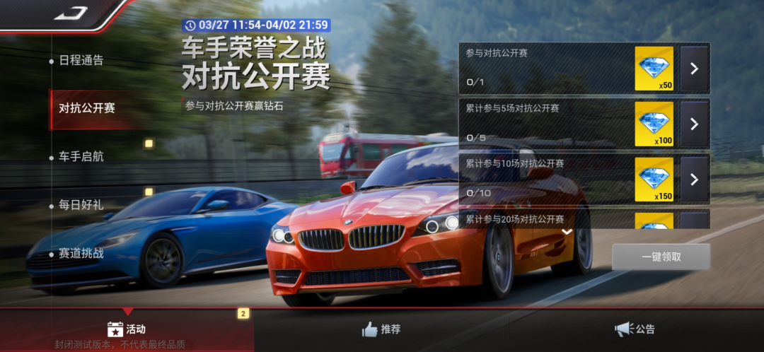 活动开始前三天,双方阵营会各公布6辆车,大家可以根据自己拥有车辆的数量、品质、改装程度等条件进行选择。这种全服范围的活动,每日更新的地图难度比较均衡,不用太关注车辆与地图的匹配度问题,按照驾驶习惯来即可~