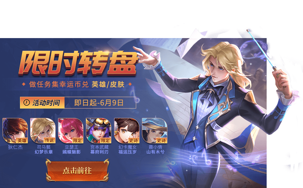 参与限时转盘完成每日登录、对局等任务,集幸运币兑换司马懿-幻梦乐章、亚瑟王-嫣蝶魅影、幻卡魔女-福运压岁、宫本武藏-幕府利刃、狄仁杰等珍贵好礼。