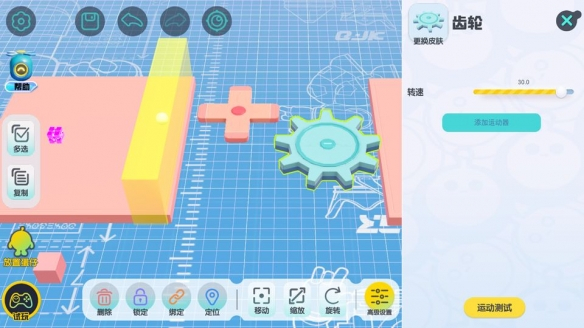 【机关组件】的详情界面中可以调整该组件的运动及其他属性参数,不同的机关会有不同的参数可以调整(比如齿轮可以调整转速)