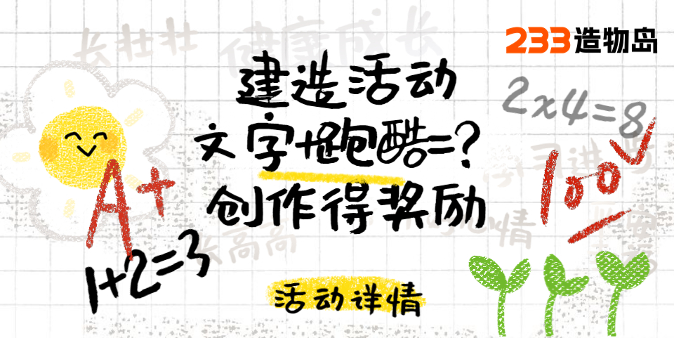 1、参与游戏:233造物岛,使用【造个跑酷】为模板,按照规定并发布 使用了“文字”功能的跑酷作品🏃。