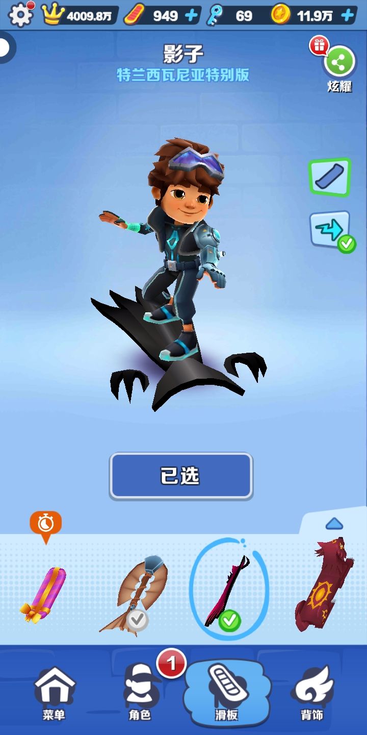 道具赛的人物可以随意搭配,滑板建议有瞬间移动的,可以帮助你更快左右移动捡能量。