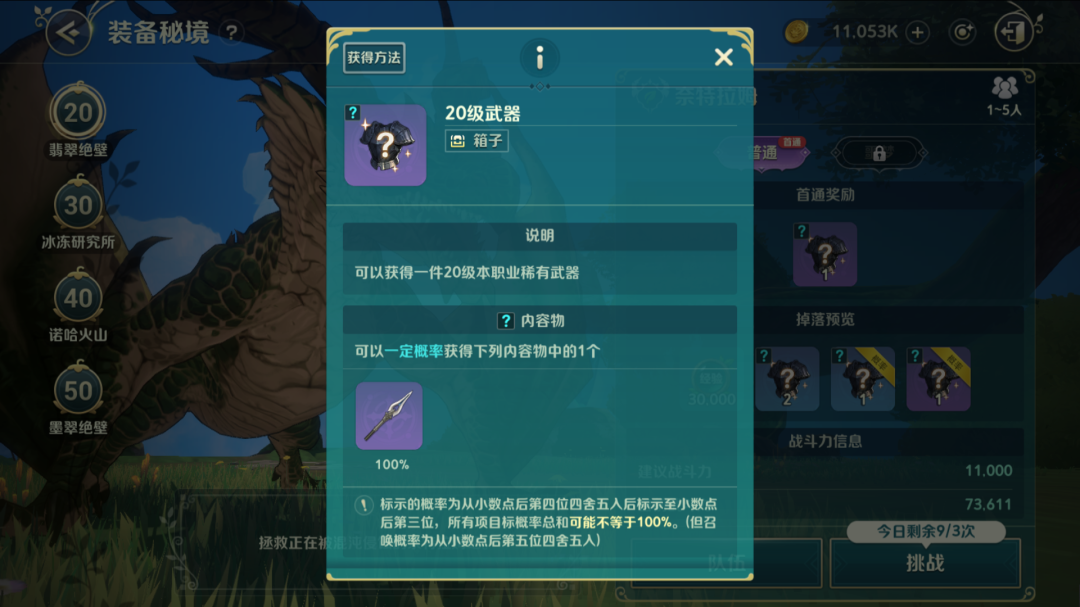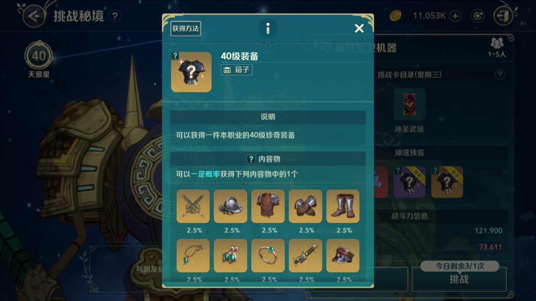 冒险家们可以通过“菜单-挑战-装备秘境”进入装备秘境。冒险家们可以根据自身战斗力,选择单人或组队前往,通过完成装备秘境副本,将100%获得首通装备奖励和优质掉落装备奖励,并且有概率获得稀有掉落装备奖励。