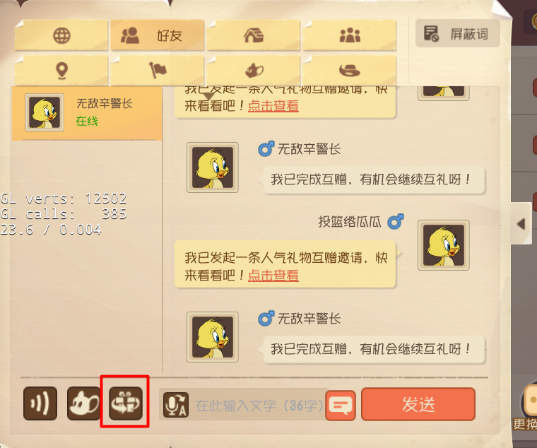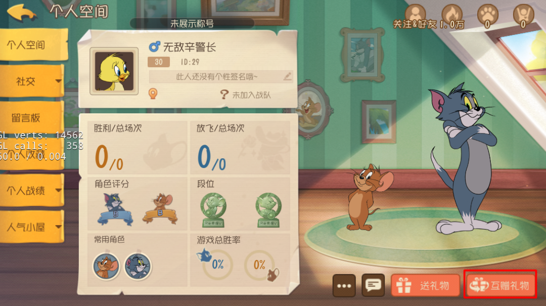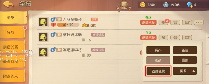为了方便小伙伴们进行礼物互赠操作,我们在游戏中设置了三处功能入口。点击好友列表选择“互赠礼物”、进入个人空间选择右下角“互赠礼物”或者在对话框页面点击进入,都是可以进行操作的哦~