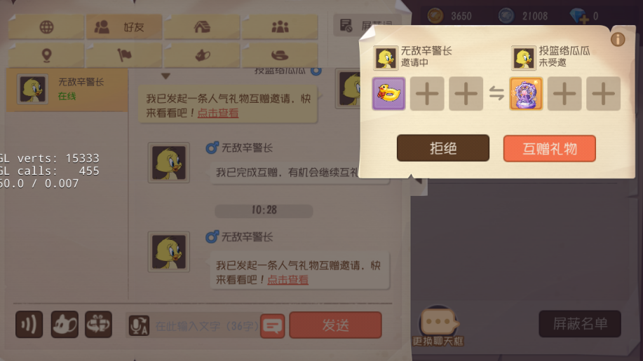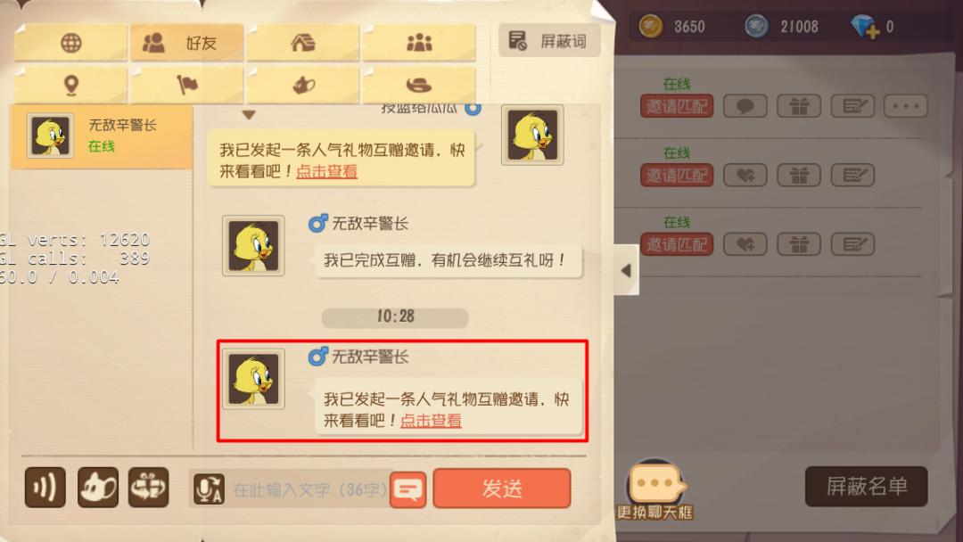 要想对好友发起互赠邀请,小伙伴的好友就需处于在线状态中,若好友处于离线、游戏中等状态时,是无法发送邀请的哦。且互赠邀请同时仅可发送一条,有未完成的互赠邀请时,小伙伴们就需要先完成或取消上条邀请,然后再尝试发送~