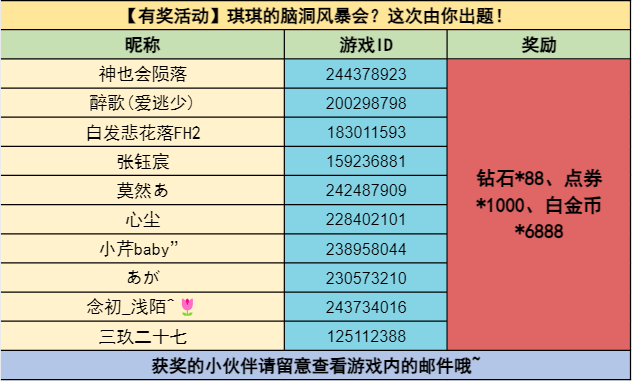 琪琪的满分答卷(10名):钻石*88、点券*1000、白金币*6888