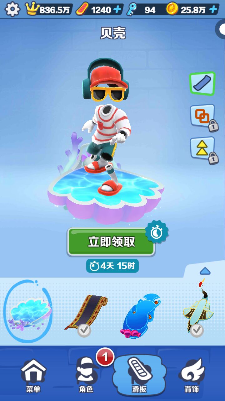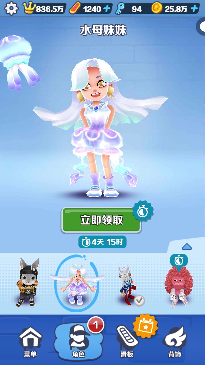 说说这滑板的技能!第一个是与水母妹妹搭配有加五倍得分,第二个是极速,这套组合,打分数赛,也是嘎嘎猛!