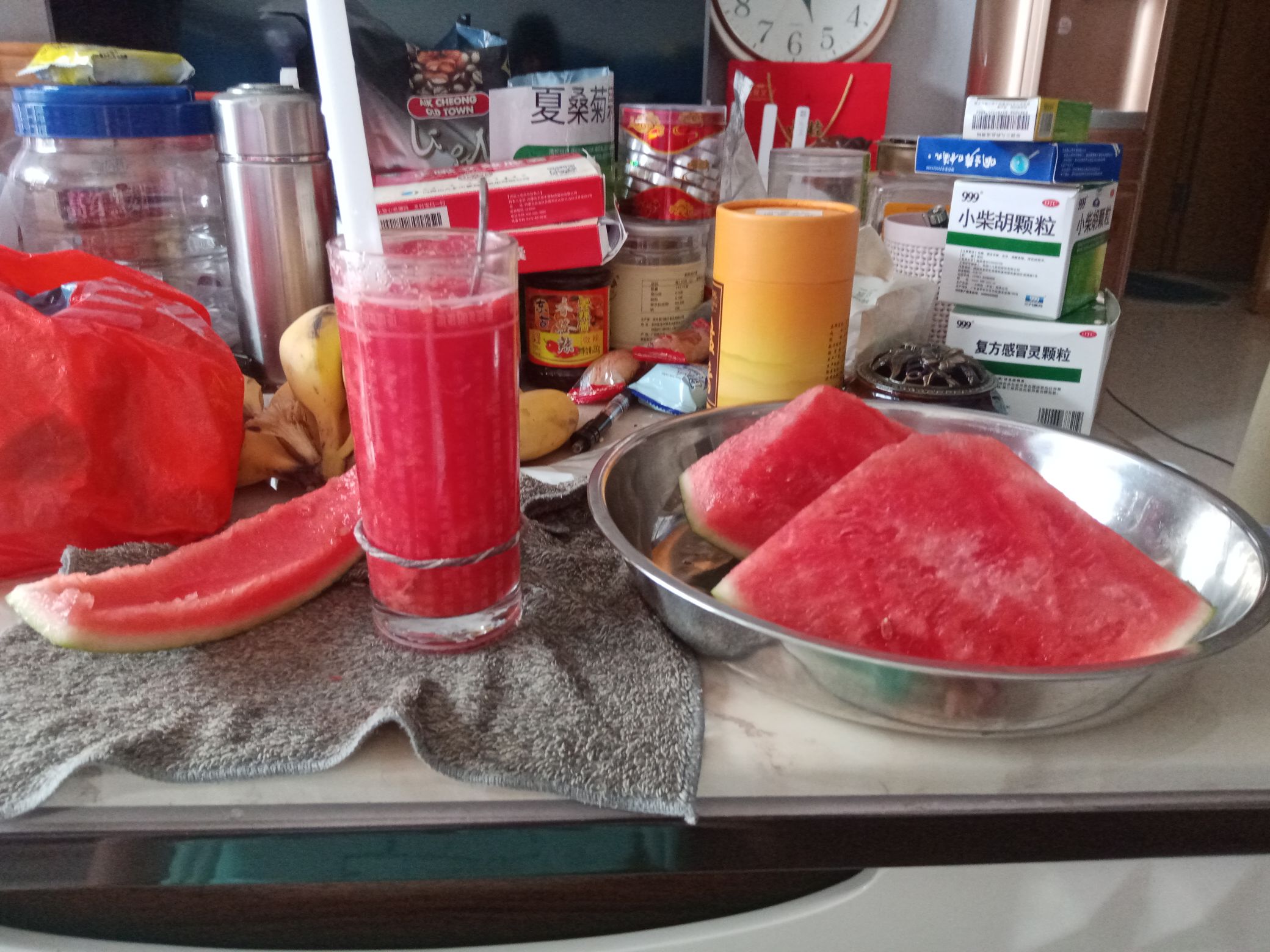 自己做的真不错,又能吃又能喝,甜的嘞,全部都是西瓜,用勺子挖,然后呢,就变成这样了