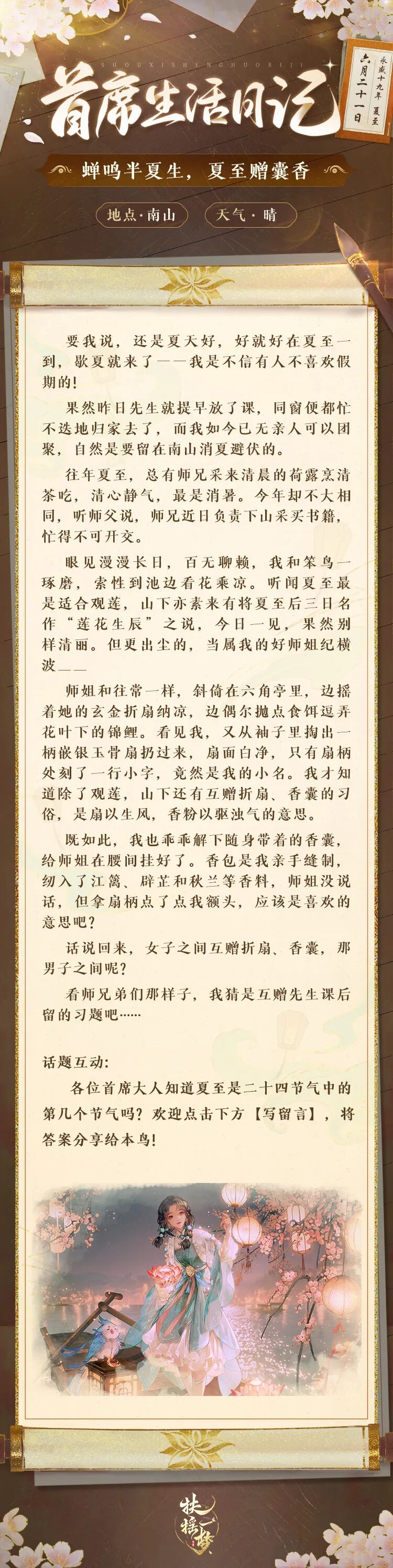晚风来去吹香远,簌簌冬青几树花。今日夏至,首席大人又在南山做些什么呢?