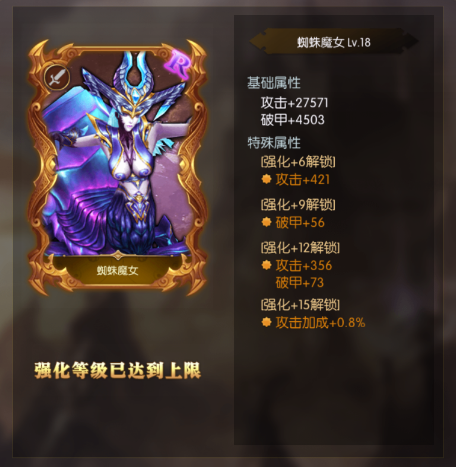 2、「强化」使用「魂卡精华」可对已镶嵌的魂卡进行强化提升,每种品质魂卡强化上限各不同,品质越高强化等级越高;强化达到特定等级可解锁魂卡的「特殊属性」额外提升属性与战力;