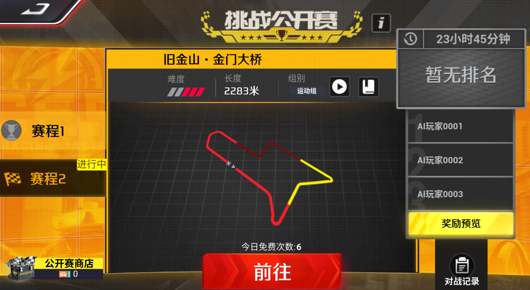 在赛程开启期间,车手们每天会有 6 次免费挑战次数,成功或者失败都会消耗1次,使用完毕后,可以通过花费单次5钻石的费用,额外购买 6 次挑战次数。每天 12 次的挑战上限,足够车手们发挥出自己的最强实力啦!