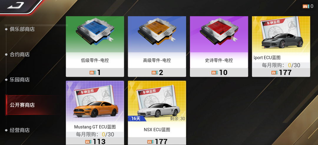 以及还有常规的钻石、金币、和公开赛奖券。其中公开赛奖券,可在商店中兑换ECU蓝图以及电控零件。
